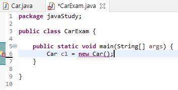 앞에서 공부했듯이 Car클래스에 생성자를 만들었다면 CarExam클래스에는 기본 생성자가 자동으로 생성될 수가 없다.