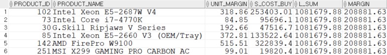 SELECT P.PRODUCT_ID, P.PRODUCT_NAME, (P.LIST_PRICE - P.STANDARD_COST) AS UNIT_MARGIN, (OI.QUANTITY * P.STANDARD_COST) AS S_COST_BUY, A.L_SUM, (A.L_SUM - A.S_SUM) AS MARGIN