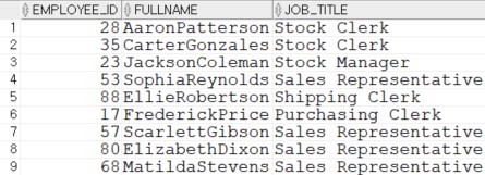 SELECT E.EMPLOYEE_ID, (E.FIRST_NAME || E.LAST_NAME) AS FULL_NAME, E.EMAIL, E.JOB_TITLE