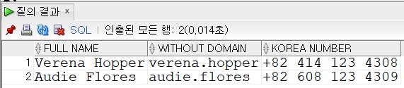 출력 : FULL NAME, WITHOUT DOMAIN, KOREA NUMBER(단, 답과 똑같이 출력하시오)