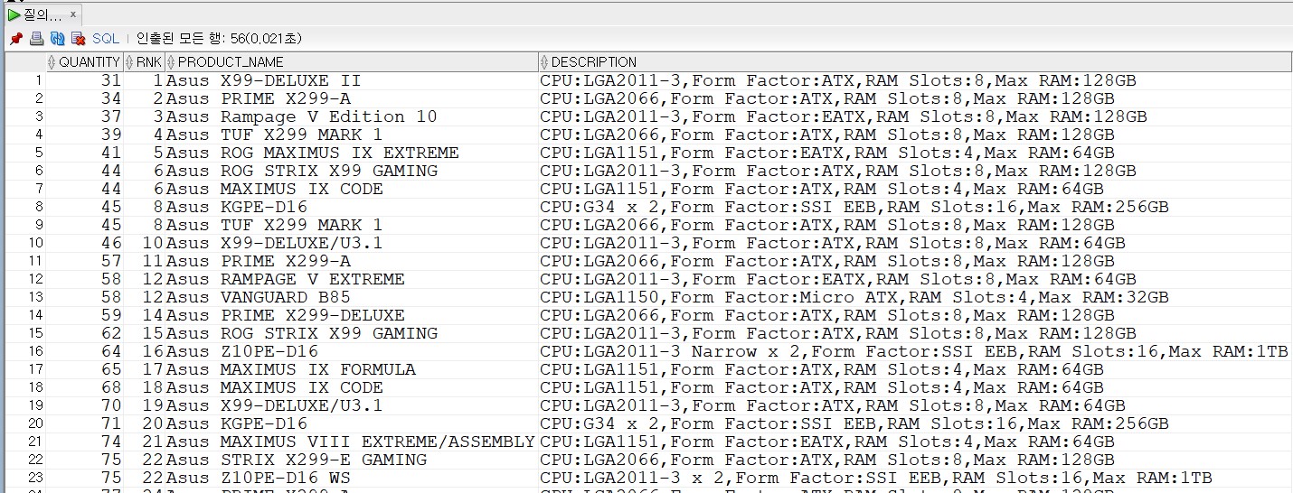 SELECT OI.QUANTITY, RANK() OVER(ORDER BY OI.QUANTITY ASC) AS RNK, P.PRODUCT_NAME, P.DESCRIPTION