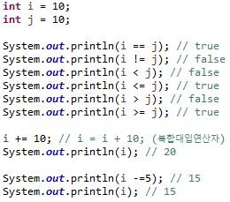 연산자 : 연산에 사용되는 표시나 기호 ( +, -, *, /, %, =, ...)